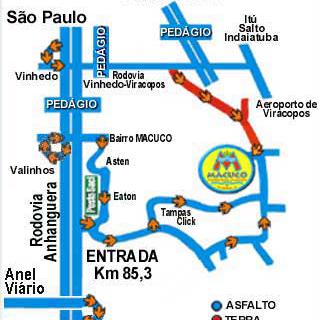 Seguir em direção a Campinas até o Aeroporto de Viracopos e entar à direita sentido Vinhedo, seguir nessa Rod. até encontar o viaduto da Rod. dos Bandeirantes, passar sob o viaduto e entrar à esquerda logo após o viaduto, estrada de terra, seguir placas de "Camping Macuco" ou "Macuco LAzer e Park Aquático", cor laranja.